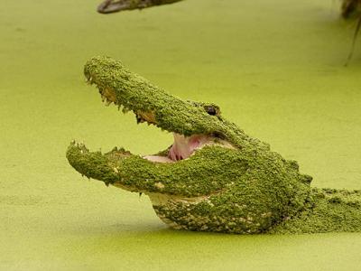 美国一条身披浮萍的美洲短吻鳄