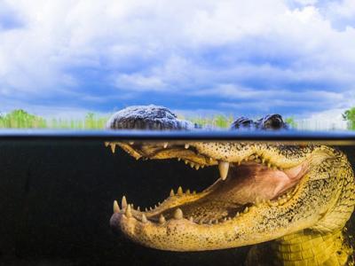 摄影师在美国佛罗里达州大沼泽地国家公园捕捉的野生鳄鱼游泳特写镜...