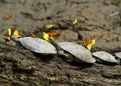 秘鲁一大群蝴蝶飞舞环绕在乌龟头部试图汲