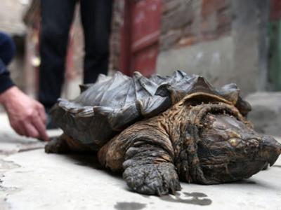 河南省汤阴县市民在河边散步时抓到大鳄龟