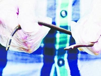 15日,湖北师范学院学生在黄石市青山湖畔发现了一条双头小黑蛇。 记者在该院学生小...