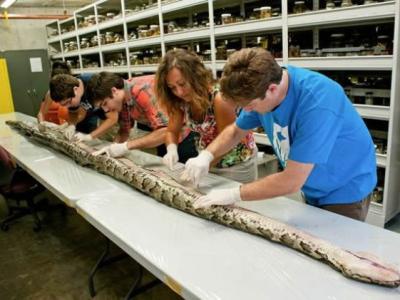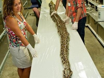 体长5.3米、体重75公斤的缅甸蟒是目前美国境内捉到的最大一条雌性缅甸蟒 解剖...