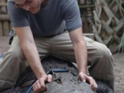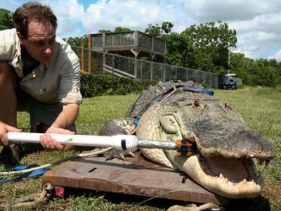 美国佛罗里达州立大学古生物学家格雷高里-埃里克松正在测量一条美洲鳄的咀嚼力 ...