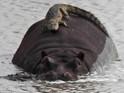 鳄鱼宝宝把一头大河马误认为一块岩石