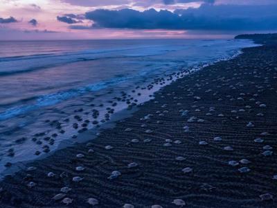 在哥斯达黎加的雨季期间,成千上万只雌性榄蠵龟每个月会有一两次来到岸上产卵,这场...