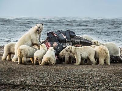 北极熊前往爱斯基摩人村庄寻找鲸肉大餐