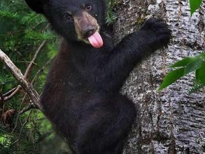 美国一淘气小黑熊爬树吐舌“做鬼脸” 美国一淘气小黑熊爬树吐舌“做鬼脸” 日...