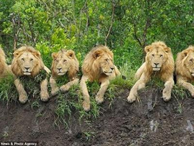 坦桑尼亚草原上6只年轻雄狮排排坐 5分钟后,其中两只狮子睡着了。 在坦桑尼亚...