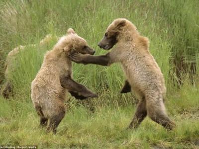 在美国阿拉斯加州卡特迈国家公园,一头熊崽用左爪子击打它同胞的面颊。 这两头...