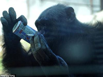 黑猩猩用左手夹着香烟,右手拿着啤酒 一只黑猩猩在中国新疆天山动物园娴熟地吐...