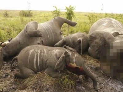 野蛮:在刚果加兰巴国家公园,直升机载偷猎者从空中枪杀了22头大象,它们的尸体堆...