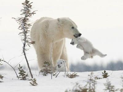 北极熊妈妈用嘴轻轻叼起孩子。此时,它们正赶往哈得逊湾海冰区,整个行程长达35英...