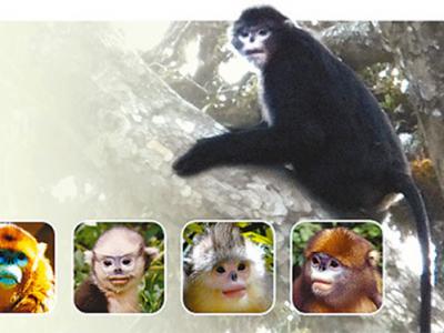 图为已发现的五种金丝猴:大图为怒江金丝猴;小图从左至右依次为:川金丝猴、越南...