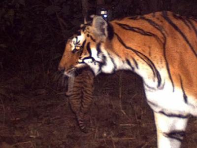 相机陷阱拍摄到一只雌性孟加拉虎嘴里叼着一只它的幼崽 同一只雌虎正和它的两只...
