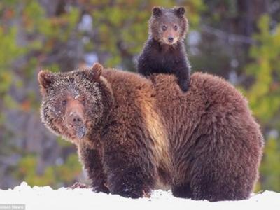 黄石国家公园小灰熊在妈妈背上“搭顺风车”