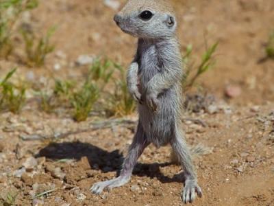 地松鼠幼仔摆出姿势,供摄影师拍照,这是它第一次离开洞穴 在妈妈转过身之后,...