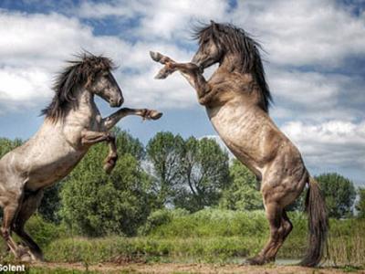 荷兰自然保护区雄性野马为争夺与母马交配权激烈大战 荷兰自然保护区雄性野马为...