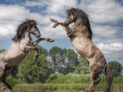 荷兰洛文斯坦自然保护区,两匹科尼卡野马后腿站立,用前腿互踹对方,争夺地盘 ...