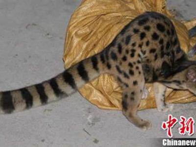 江西遂川发现斑林狸 24日上午,江西吉安遂川县野保站的工作人员小心翼翼地将一只...