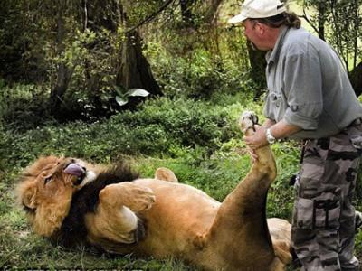 英国动物饲养员给雄狮做足底按摩 劳伦提把佳姆拥入怀中,他说这只狮子完全信任...