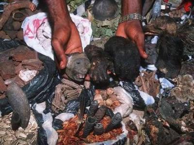 野生动物肉非法贸易日益猖獗。在刚果的一个市场上,人们可以买到猩猩的头颅和肢体...