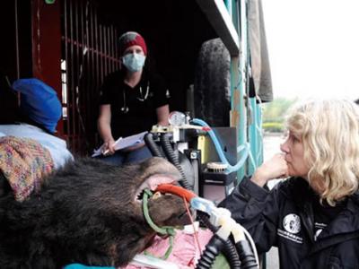 黑熊OLIVER在途中病情恶化,兽医不得不在卡车里为它做了胆囊摘除做手术。供图/亚...