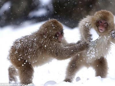 日本猕猴野外打雪仗 一群生活在山区的猕猴兴致勃勃地玩起了打雪仗的游戏 ...