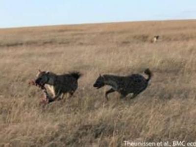 两只黑斑鬣犬边争夺羚羊脊柱,边用“笑声”作身份地位年龄大比拼。 科研人员...
