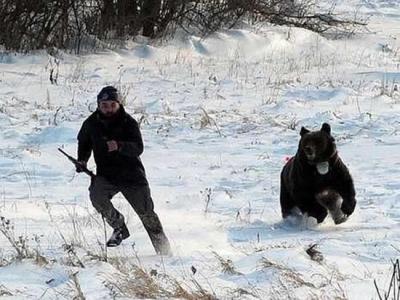 挨了第一枪之后,棕熊依然清醒。 棕熊跳起来追逐警察。 警察不停变线奔跑,...