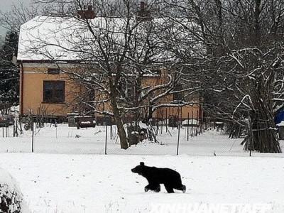 1月8日,在波兰普热梅希尔,一只狗熊在一幢房屋外徘徊。 1月8日,在波兰普热梅希...