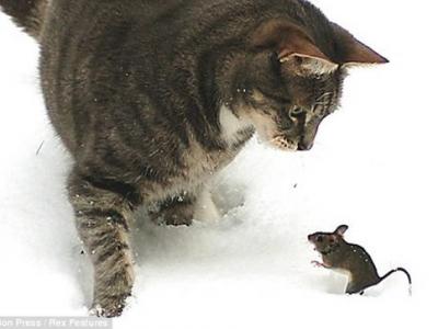 小老鼠举起了小爪子,准备与敌人进行战斗 摄影师拍摄到德国雪地上一只小老鼠不...
