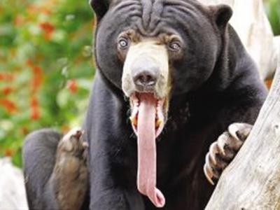 马来熊吐出长舌头 愁眉苦脸的马来熊 据英国媒体15日报道,美国野生动物摄影师...