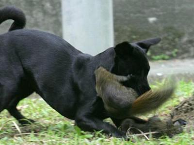 小松鼠在黑狗的爪下无力挣扎,狂怒的松鼠妈妈蓄势待发,正欲从树上跳下。 松鼠...