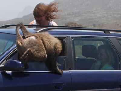 狒狒进入车内 狒狒将车内弄得一团乱 狒狒要拉开车门 狒狒吃游客的水果 ...