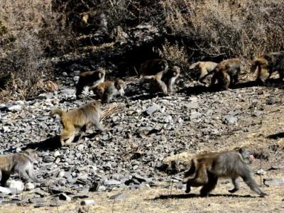 西藏林芝大批野生猕猴下山觅食