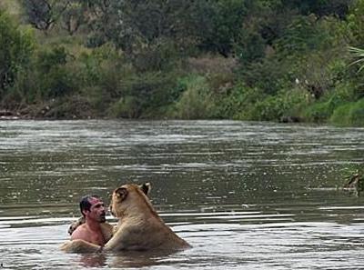 南非动物学家与狮子河中洗澡