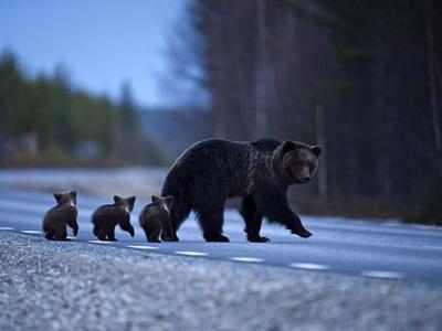 瑞典一头母熊带领它的孩子过马路