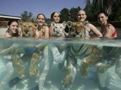 老虎和狮子戏水 2008年9月24日,在美国南卡罗莱纳州桃金娘海滩的大型濒危和...