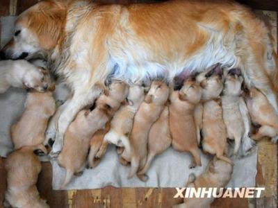 江苏淮安市民陆先生饲养的爱犬“金毛”于半个月前一胎产下了15只小狗,而且个...