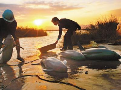 四条江豚温州搁浅 显得无助的江豚 江豚被放生 竟然一...