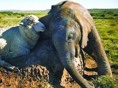 南非山瓦里野生动物保护区小象与绵羊相依为命 南非山瓦里野生动物保护区小象与...