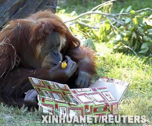 这是2007年6月美国迈阿密一个动物园里的红毛猩猩Nonja在吃水果的资料照片。新华社...