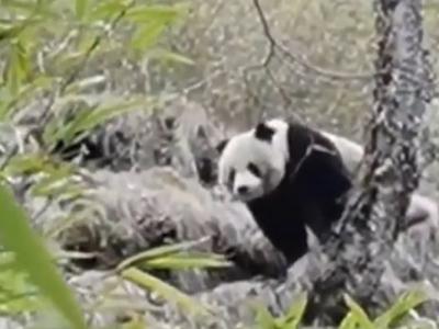 职员首日发现的野生大熊猫。职员发现野生大熊猫母子,幼崽爬上...