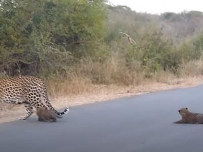 南非克留格尔国家公园花豹宝宝过马路时忽然趴下不动 豹妈妈赶紧回头引导(神秘的地...
