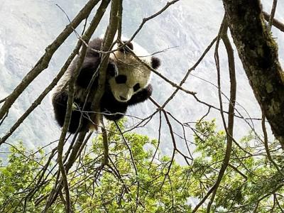 一只野生大熊猫宝宝在树上移动后,安然大睡。工作人员估计熊猫...