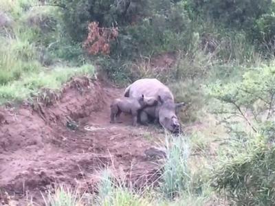 南非国家公园犀牛宝宝望唤醒亡母喂奶