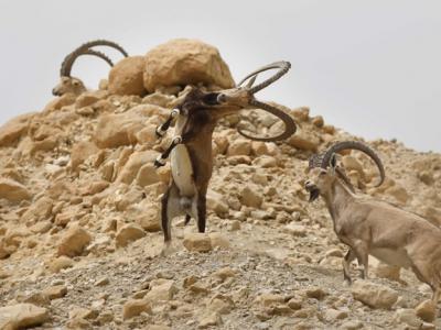 以色列荒漠多只雄性努比亚山羊为争取交配