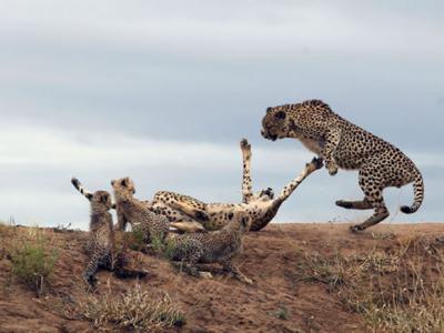 南非公豹偷袭 豹妈妈弹起来保护孩子