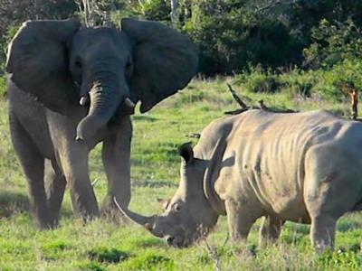 南非克鲁格国家公园爱玩的大象遇到紧张的犀牛视频:...