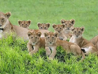 非洲坦桑尼亚塞伦盖提国家公园狮子家族一起望着镜头拍照 (神秘的地球报...